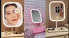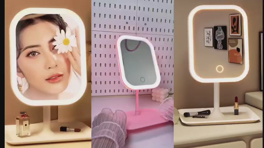 Espelho de mesa moderno com iluminação LED ajustável, disponível nas cores BRANCA e ROSA. Design elegante com formato retangular de cantos arredondados e base com bandeja para maquiagem e acessórios. O espelho possui botão sensível ao toque e luz suave ideal para maquiagem ou cuidados pessoais. Ambiente minimalista e acolhedor em tons neutros, destacando o produto como peça decorativa funcional e sofisticada para penteadeiras e cômodas.